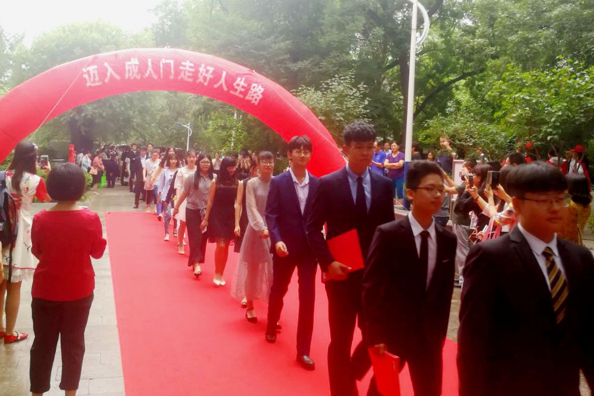 伴着青春的旋律,踏着盛夏的步伐,全体高三学生身着靓丽并富有朝气的衣装,穿过成人门,迈向崭新的未来。通过大屏幕播放的视频,师生们回顾了高中三年的快乐时光,有欢乐、有泪水、有拼搏、更有收获。从学校领导手中接过《中华人民共和国宪法手册》和毕业证书,面对国旗庄严的宣誓,从此肩负起一名中华人民共和国公民的责任和义务。
