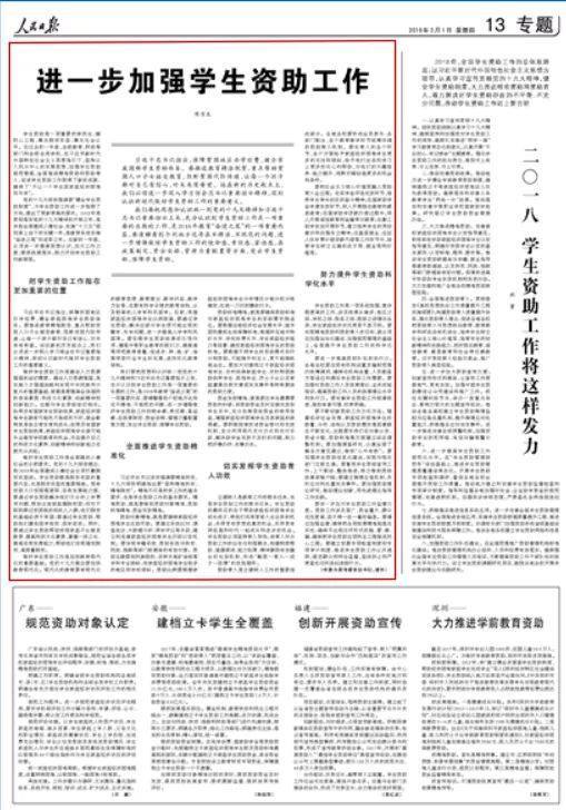 学生资助是一项重要的保民生、暖民心工程,事关脱贫攻坚,事关社会公平。党的十九大报告强调要“健全学生资助制度”,为学生资助工作进一步指明了方向,提出了更新更高的要求。如何认识新时代做好学生资助工作的重要意义?学生资助精准化如何推进?教育部长陈宝生今天在《人民日报》撰文,阐述如何进一步加强学生资助工作,一起看。